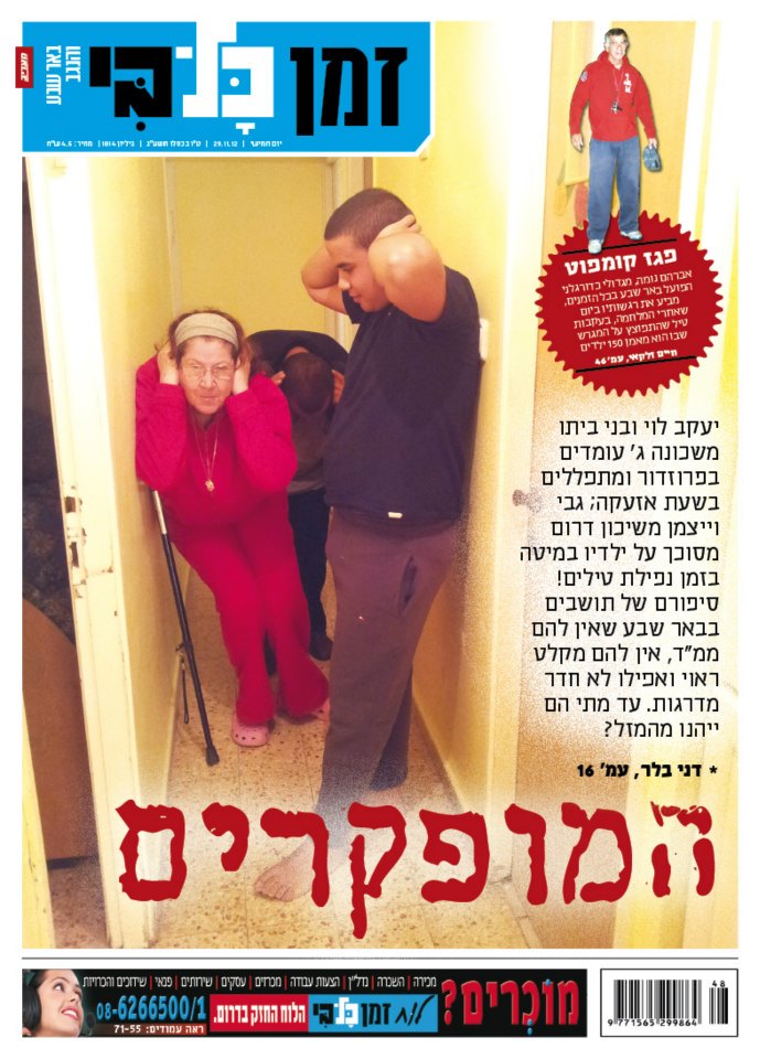 29 בנובמבר 2012: שער הגיליון של זמן-כל בי עם כתבה על תושבים בבאר שבע שאין להם מיגון וכשיש אזעקה, הם עומדים בין שני קירות גבס