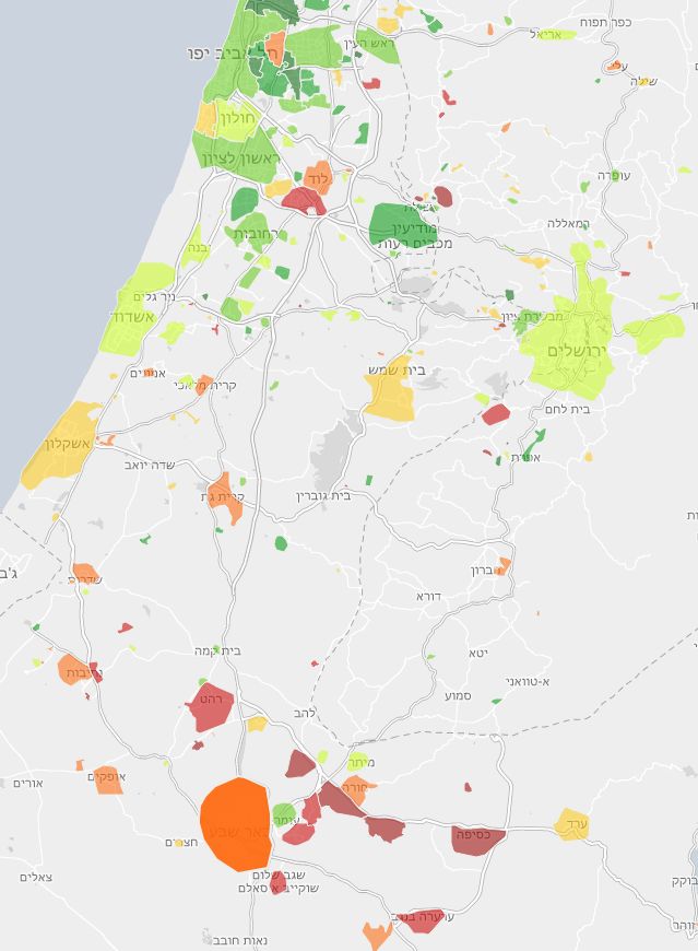 מפת הפערים: שילוב של מבחני מיצ''ב ובגרות. בירוק, הישגים גבוהים במרכז הארץ. ככל שיורדים דרומה, בצבעי כתום ואדום, הישגים נמוכים (מקור: אתר מדל''ן).jpg)