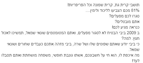 ''תושבי קרית גת, קרית שמונה וכל הפריפריות! 81% מכם הצביעו לליכוד ולימין.... סגרו לכם מפעלים? אתם מובטלים? כנראה מגיע לכם! ב 2009 ביבי הבטיח לא לסגור מפעלים, ואתם המטומטמים שונאי שמאל, תמשיכו לאכול חצץ. למה? כי ביבי יודע שאתם שפוטים שלו ושל שרה, ביבי מזהה אתכם כעבדים שחורים ושונאי שמאל. מה איכפת לו, הוא חי על חשבונכם, אשתו גונבת חופשי, משפחה מושחתת ואתם תסבלו לעד! תהנו מביבי עד 120...'', נכתב באחת הקבוצות, הרוויה בקריאות לא לעזור לתושבי הדרום וכל מי שהצביע ימין.