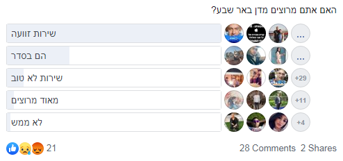 במשאל שנערך בקבוצת הפייסבוק ''באר שבע ביחד'', בה חברים למעלה מ-110,000 איש, באשר למידת שביעות הרצון של הבאר שבעים מחברת דן באר שבע, זכיינית התחבורה העירונית, עלה בבירור כי הרוב המוחלט (411 מצביעים) סבורים ש''השירות זוועה''. לעומתם, 120 מצביעים סברו ש''הם בסדר''. 32 סברו שהשירות ''לא טוב'', 14 היו ''ממש מרוצים'' ו-7 ''לא ממש מרוצים''.