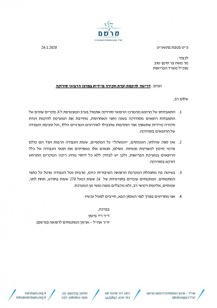 במכתב ששלחה הבוקר ד"ר ביטון, היא כתבה בין היתר: "התאבדותו של הרופא מהמרכז הרפואי סורוקה אתמול בערב המצטרפת ל-3 מקרים שונים של התאבדות רופאים מסורוקה בשנה וחצי האחרונות, מחייבת את המערכת להקמת ועדת חקירה מיידית שתשפוך אור על הנסיבות שהובילו לאירועים הטרגיים הללו, ועל סביבת העבודה של הרופאים בסורוקה".