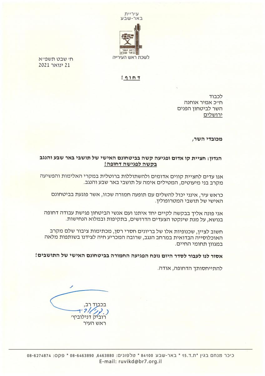 מכתב חריג של ראש עיריית באר שבע רוביק דנילוביץ', לשר הביטחון פנים, אמיר אוחנה: תחת הכותרת ''חציית קו אדום ופגיעה קשה בביטחונם האישי של תושבי באר שבע והנגב בקשה לפגישה דחופה!''