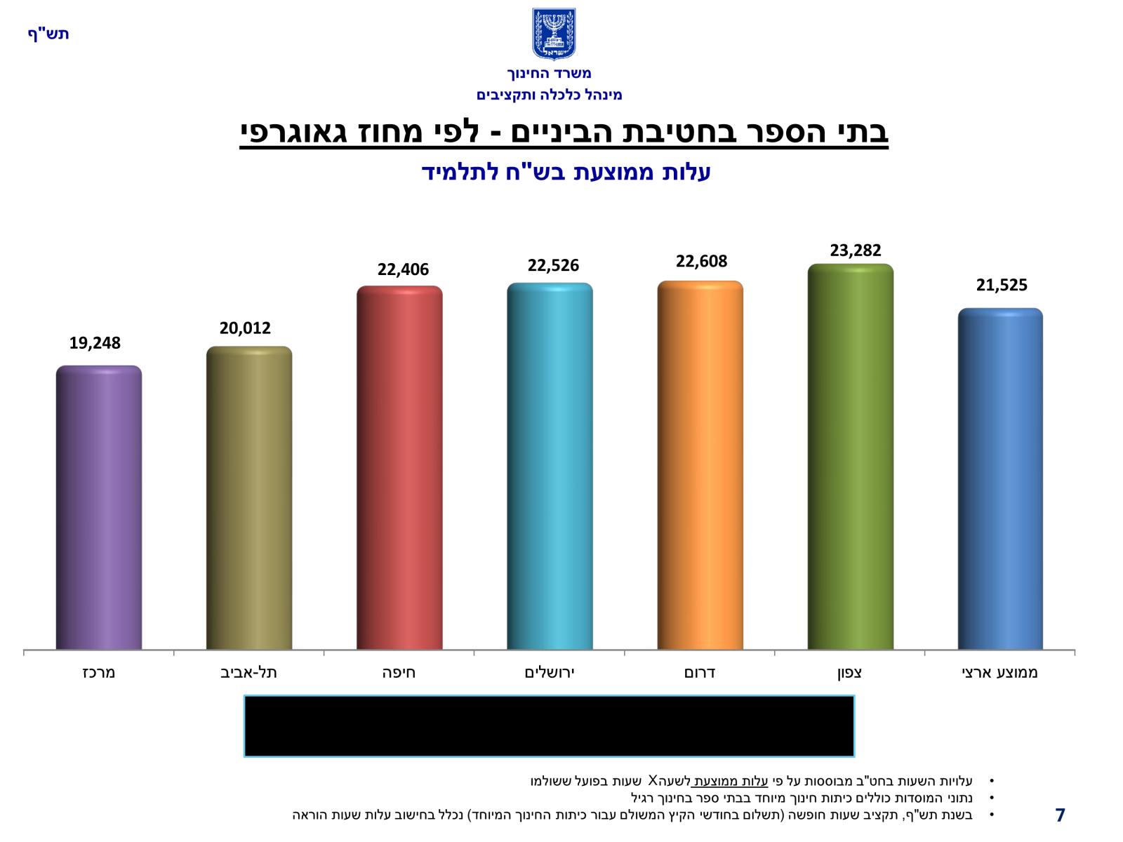 בחטיבת הביניים - מחוז הדרום זוכה לתקציב הגבוה: העלות הממוצעת לתלמיד עומדת על 22,608 שקלים.