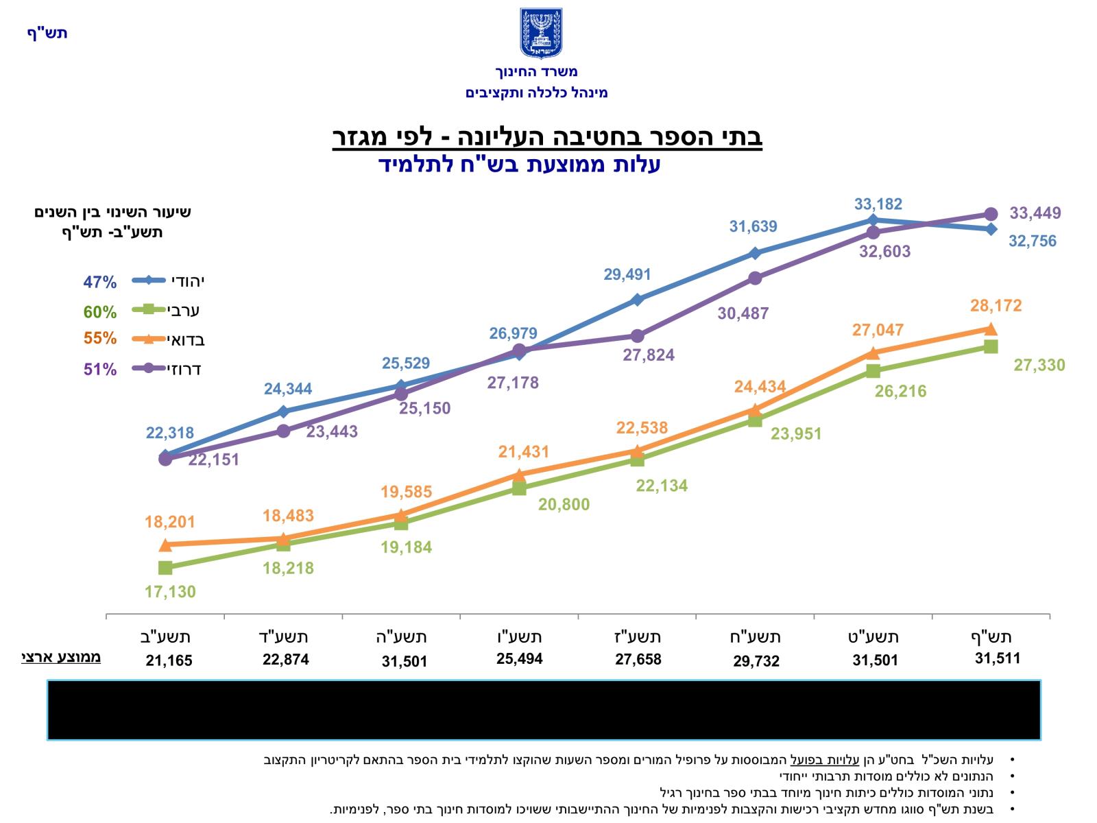 התקציב לתלמיד ערבי ובדווי ביסודי גדל פי 1.5 יותר ביחס לתקציב של תלמיד יהודי באותו שלב חינוך. בחטיבת הביניים התקציב לתלמיד במגזר הערבי והבדווי גדל פי שניים ביחס לתקציב של תלמיד במגזר היהודי. עלות ממוצעת לתלמיד ערבי בחטיבה העליונה עלתה ב-60% בין השנים תשע"ב-תש"ף, מ-17,130 ₪ בשנת תשע"ב ל- 27,330 ₪ בשנת תש"ף.