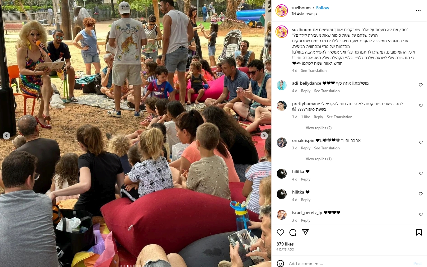 סוזי בום בשעת סיפור בגן מאיר בתל אביב (צילום: מתוך עמוד האינסטגרם של סוזי בום / שימוש הוגן על פי סעיף 27 א')