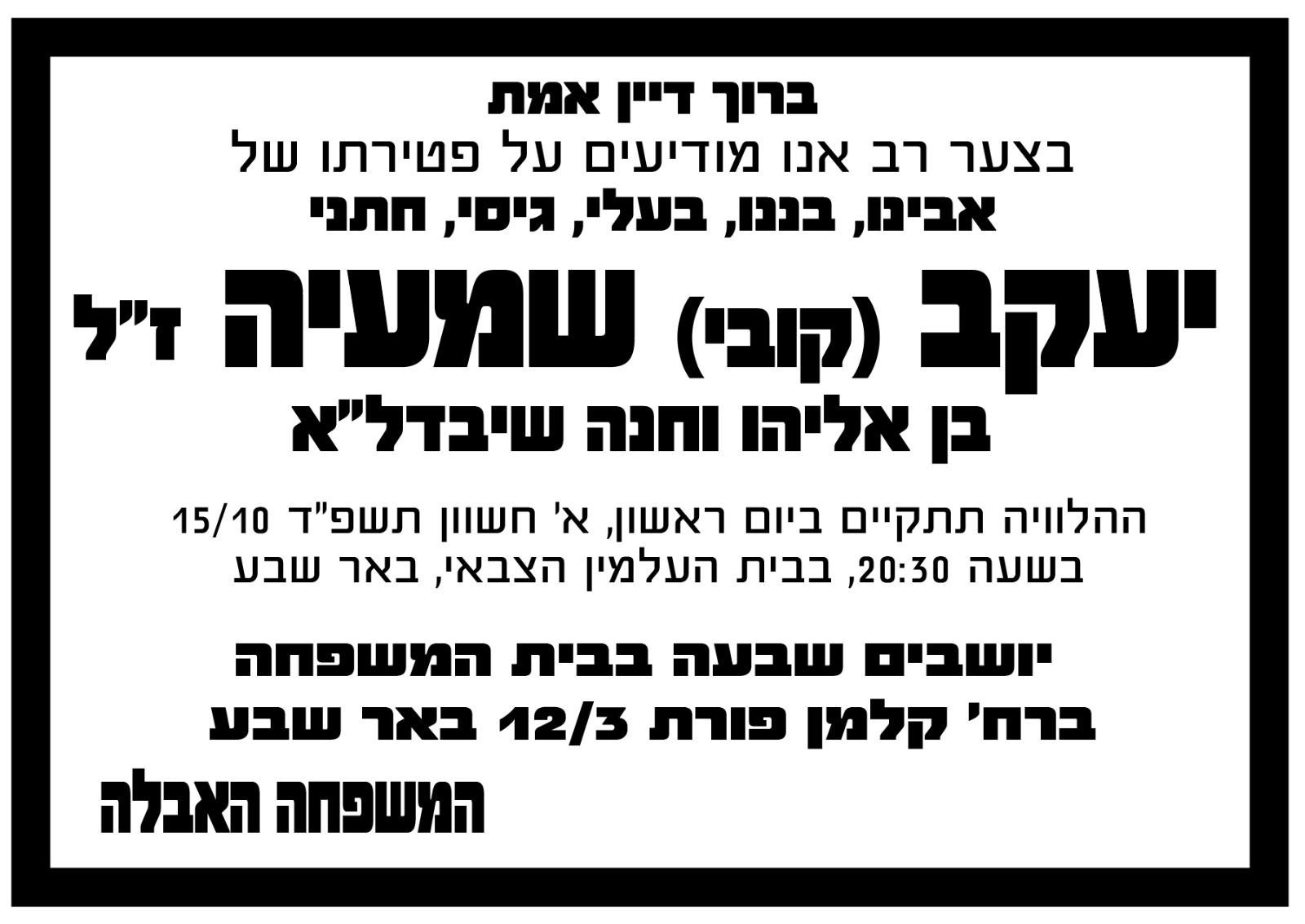 טרגדיה בבאר שבע: הבן אושר שמעיה ז"ל נרצח במתקפת הטרור בנגב, אביו קובי היה בחזקת נעדר. אתמול התברר: קובי שמעיה נרצח יחד עם בנו במתקפת הטרור בשבת. רעייתו של קובי, אבלין, קיוותה לבשורה טובה, אך אתמול הודיעו לה כי גופת בעלה זוהתה בוודאות. אבלין כתבה בפייסבוק שלה: "ברוך דיין האמת, גופתו של קובי זוהתה. מועד הלוויות של קובי ואושר יימסרו בהמשך". היום, שני, הם מובאים למנוחות..jpg)
