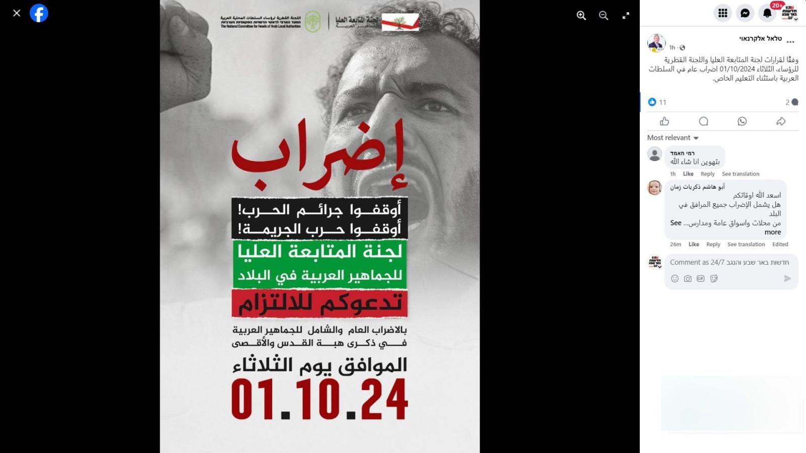 בהתאם להחלטות ועדת המעקב העליונה והוועדה הארצית של ראשי הרשויות, יתקיים ביום שלישי, 01/10/2024, שביתה כללית ברשויות הערביות, למעט מערכת החינוך המיוחד''.