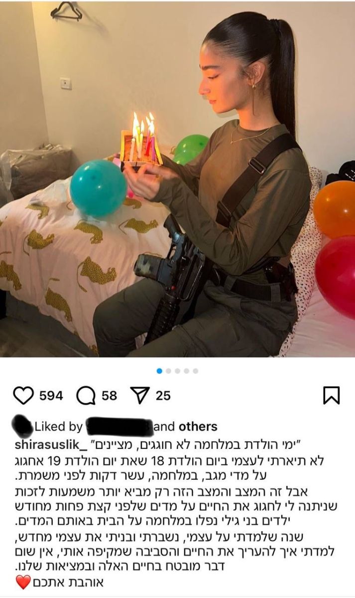 “ימי הולדת במלחמה לא חוגגים, מציינים. לא תיארתי לעצמי שיום הולדת 18 יהיה האחרון שאחגוג כאזרחית, ויום הולדת 19 אחגוג על מדים, בעשר דקות לפני משמרת.”