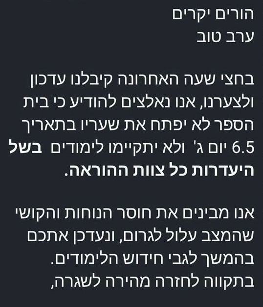 במקביל, משרד החינוך פועל בנחרצות: מנהלי מחוזות התבקשו לזמן את מארגני ההשבתה לשימועים מיידיים, תוך אזהרה כי יבוצעו קיזוזים בשכר. במשרד מזהירים גם מפני גורמים פוליטיים שחדרו למחאה ומסיתים מורים לשבות בניגוד לחוק, תוך שימוש מופרז באישורי מחלה.