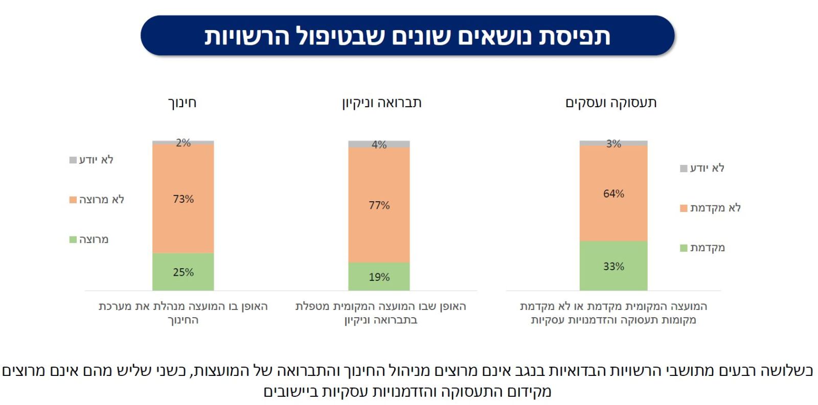 על רקע פילוחי העומק שהסקר מציג, בולטת מגמה נוספת: תחושת נתק חריפה בין הנהגת היישובים לבין התושבים עצמם. דפוס זה עולה בצורה ברורה ביישובים שבהם תחלופת הנהגה כמעט ואינה קיימת, והציבור חש כי מי שמייצג אותו פועל יותר לשימור כוח מאשר לטיפול בבעיות האמיתיות שעל סדר היום. בחלק מהקהילות קיימת כבר קריאה פנימית גלויה לרענון מנהיגותי.