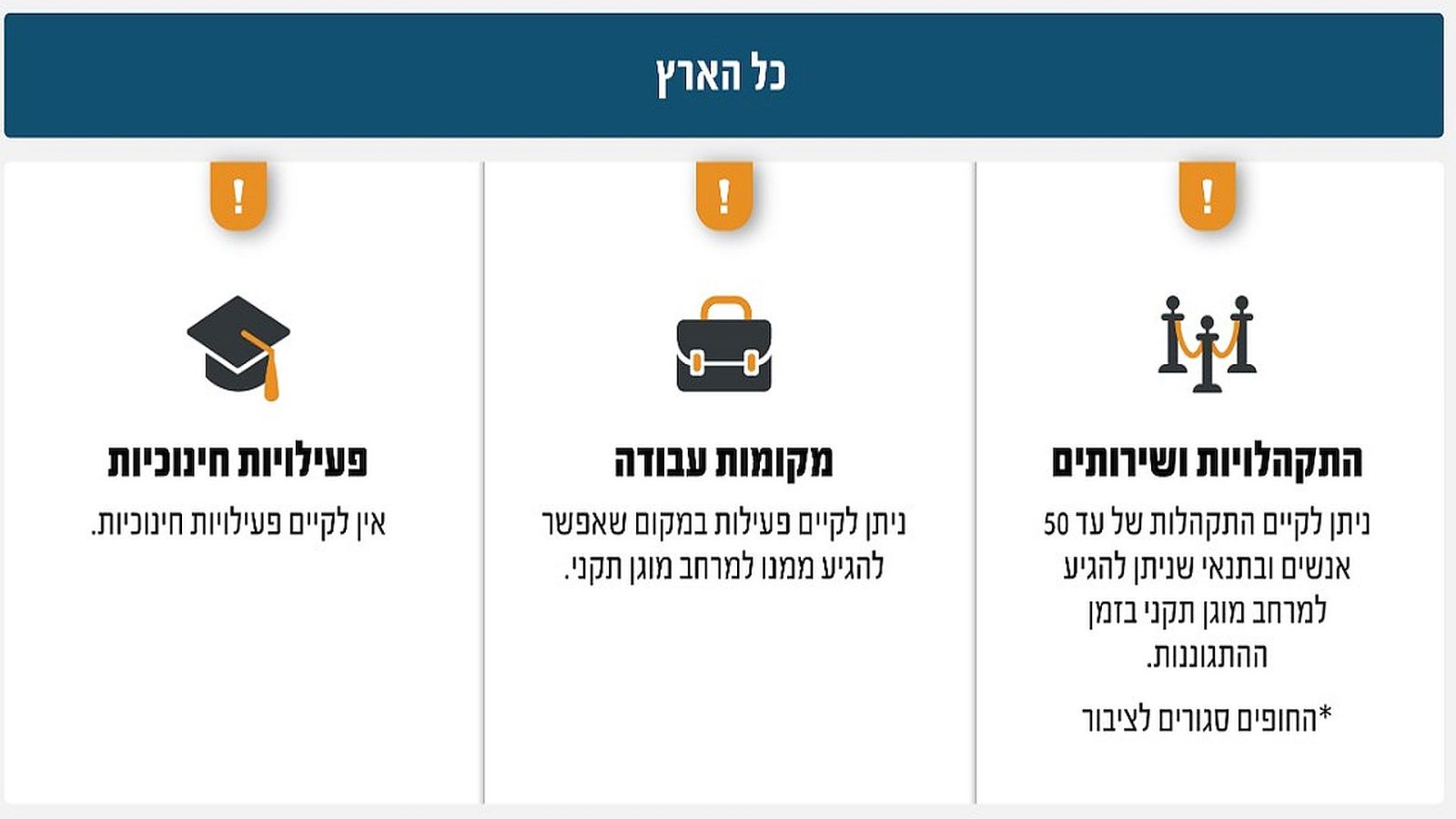 לפי ההנחיות המעודכנות, לא יתקיימו בשלב זה פעילויות חינוכיות במוסדות החינוך ברחבי הארץ. במקביל, תותר קיום התקהלות של עד 50 בני אדם בלבד, ובתנאי שניתן להגיע בזמן ההתגוננות למרחב מוגן תקני.
