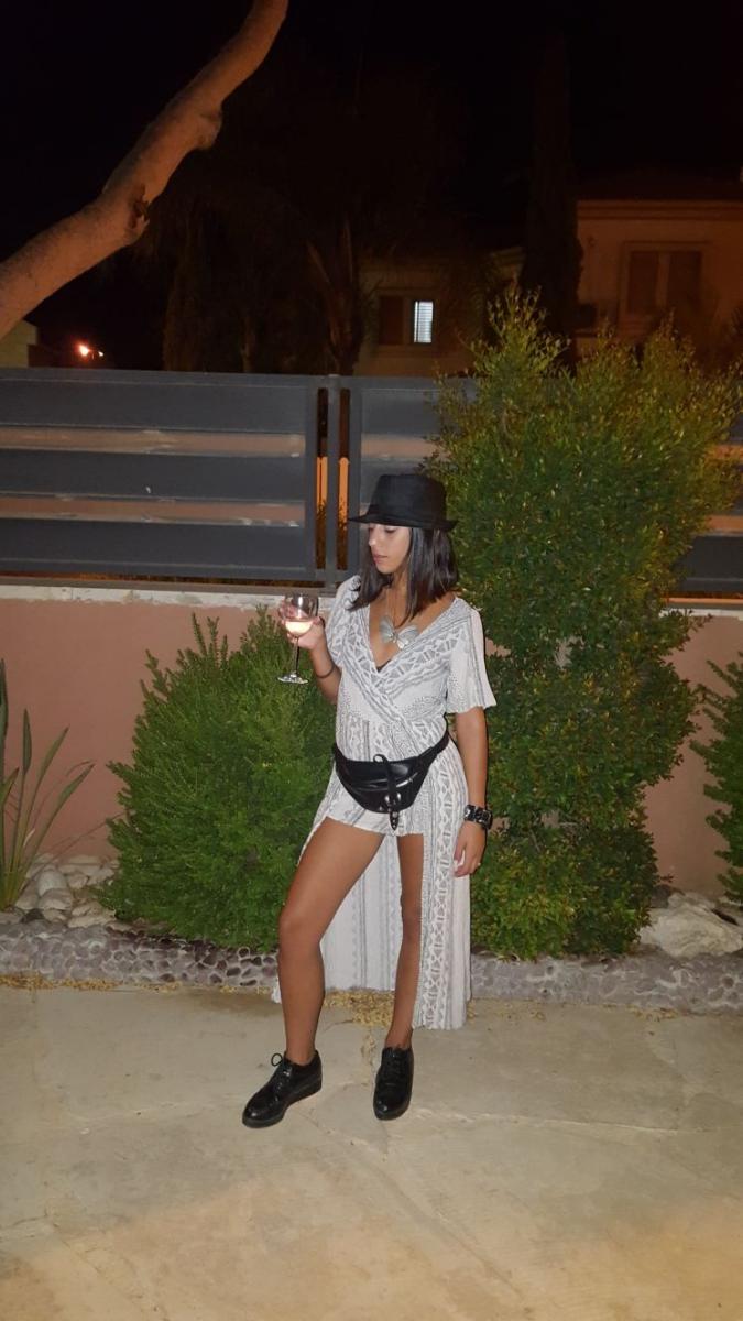 בלוק הראשון, לוק בין ערביים, אוברול עם גזרה ממש מעניינת: שורטס בחלק הקדמי וארוך בחלק האחורי, מחשוף חביב באזור בית החזה וכדי לפלפל את האווירה תוספת שרשרת פרפר כסופה.