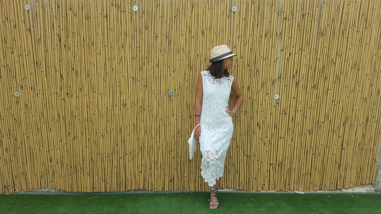 בלוק השני (כן, אנחנו עדיין בקטע של דמיון מודרך על חופשה ביוון), יופי של שמלה לבנה מבד תחרה משגע שמנקה לנו את העיניים, שילוב של סנדלי גלדיאטור כסופות (בחירה מצוינת של צבע לתחרה הלבנה) ושכדי שחס וחלילה לא תצטרך להחזיק ביד את הפלאפון, ליפסטיק, ומפתחות לחדר ליז הוסיפה תיק יד לבן שממשיך את הטוהר של השמלה באופן די מדויק ומוכיח שלא תמיד חייב "לשבור" עם עוד צבע. לסיום ולסגירת ההופעה: כובע קש, שלא נשכח שהחיים הם חופש אחד גדול עם עוד תוספת של צבע על טהרת הבהירים.