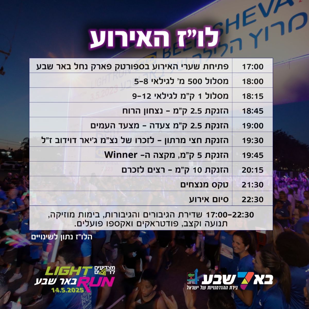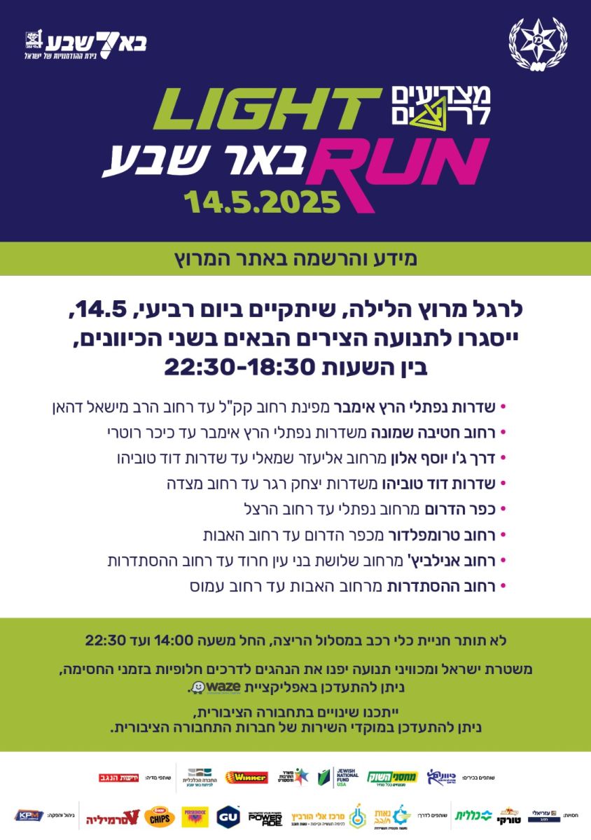 В среду, 14 мая 2025 года, состоится городской спортивный праздник: ночной забег Light Run в Беэр-Шеве, организованный муниципалитетом Беэр-Шевы и компанией «Кивуним» при участии ЦАХАЛа и продюсерской компании «Кфаим». Тысячи бегунов со всей страны примут участие в забегах на различных дистанциях, старт и финиш которых будут находиться в спортивном парке Нахаль Беэр-Шева. В этом году мероприятие пройдет под знаком «Чествуем бегунов» – с особым акцентом на чествовании солдат ЦАХАЛа, инвалидов ЦАХАЛа, сил безопасности и памяти павших в войнах Израиля.