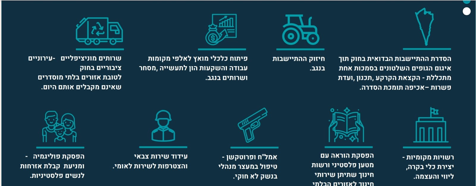 Дополнительная группа сосредоточится на поощрении службы в армии и национальной службе. В сфере местного управления акцент будет сделан на укреплении управленческих структур и нормативно-правовой базы. В решении также содержится упоминание о региональных советах, предоставляющих услуги как признанным, так и непризнанным бедуинским деревням. Министерству внутренних дел поручено пересмотреть организационную и географическую структуру этих советов с целью оптимизации предоставления муниципальных услуг.